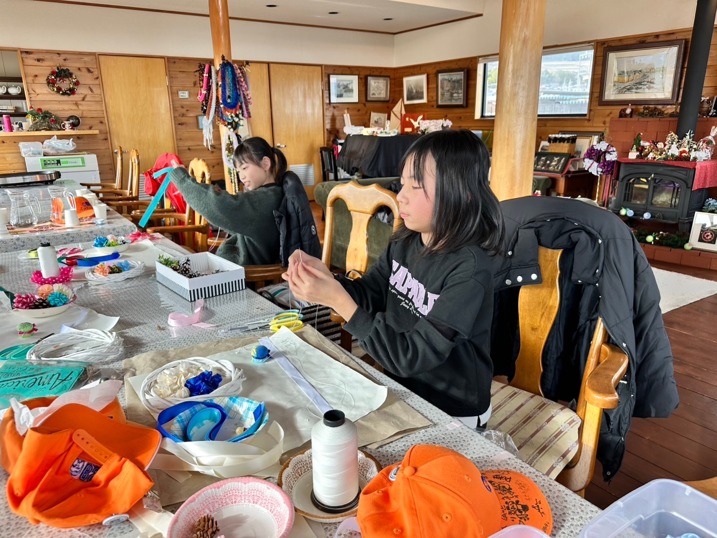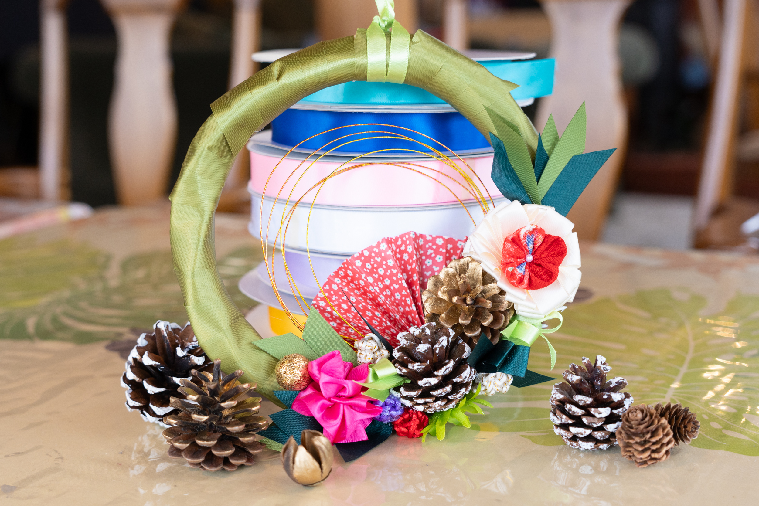 ウインターキャンプでは、スキーやスノーボードではなく、室内で楽しむリースクラフトも選択できます。