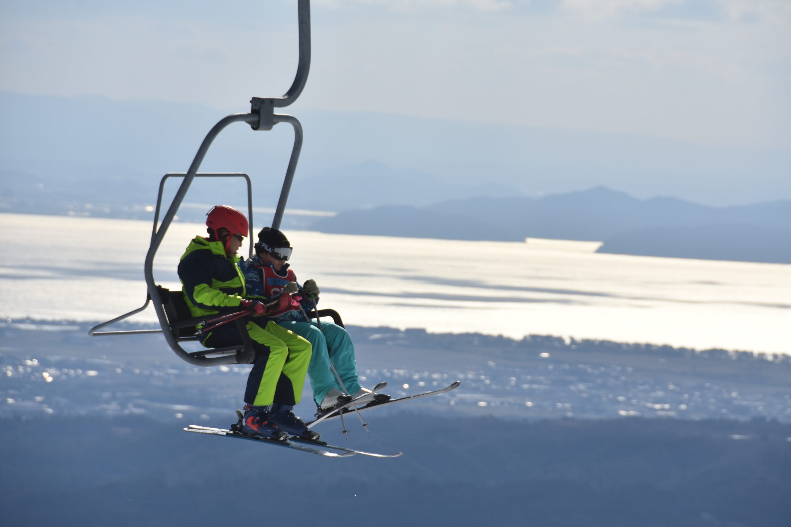 滋賀県北部、びわこ箱館山スキー場まで行き、スキーやスノーボードに挑戦します。