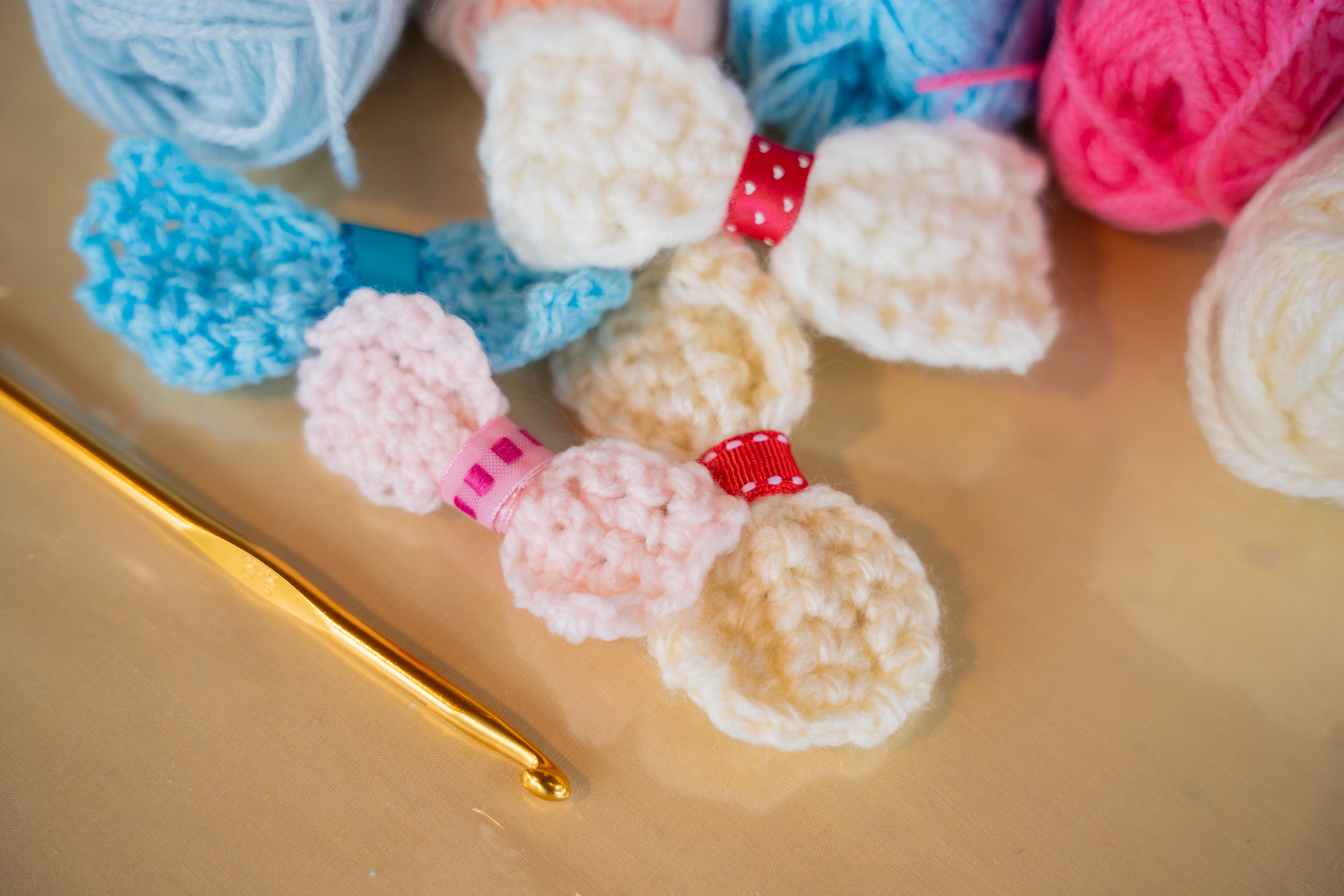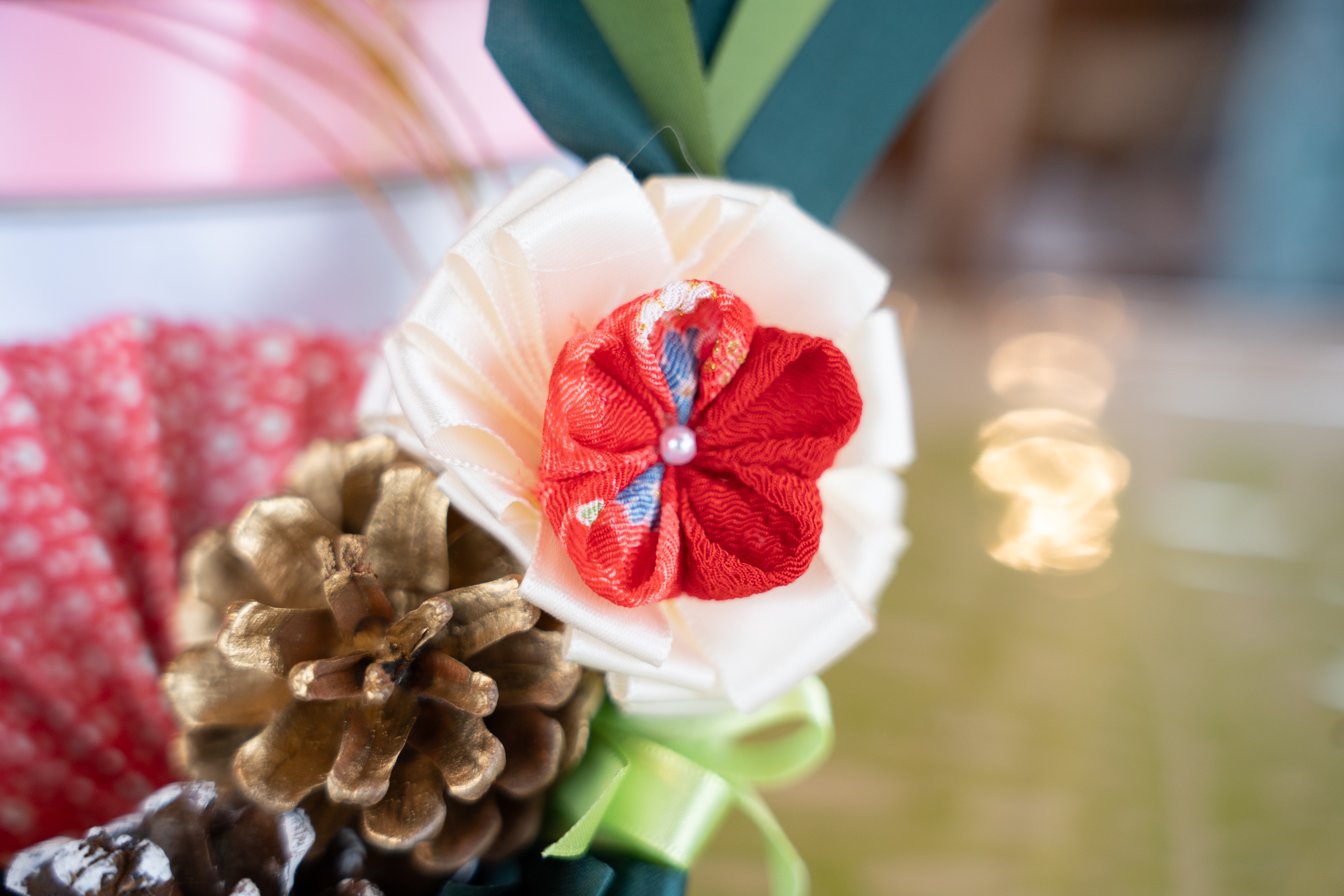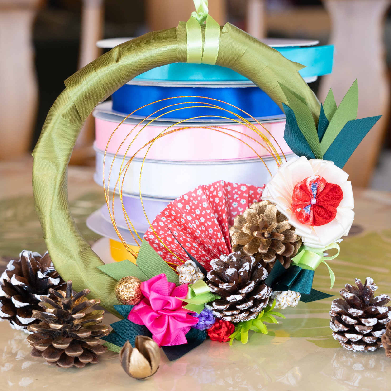 リースが完成したら、毛糸を使ってリボンのブローチをつくりましょう!