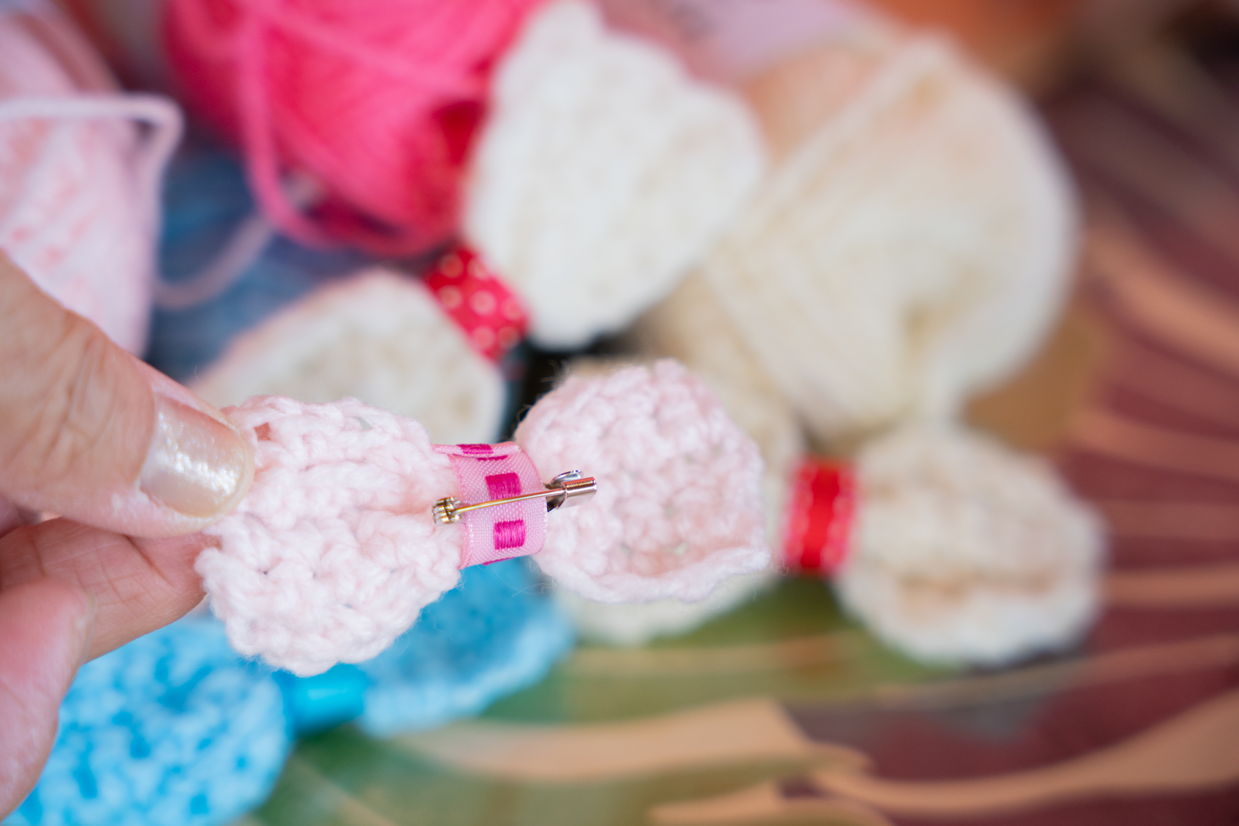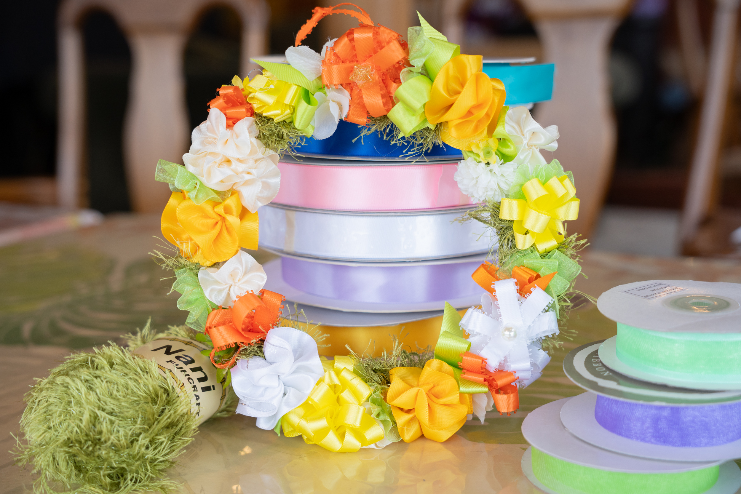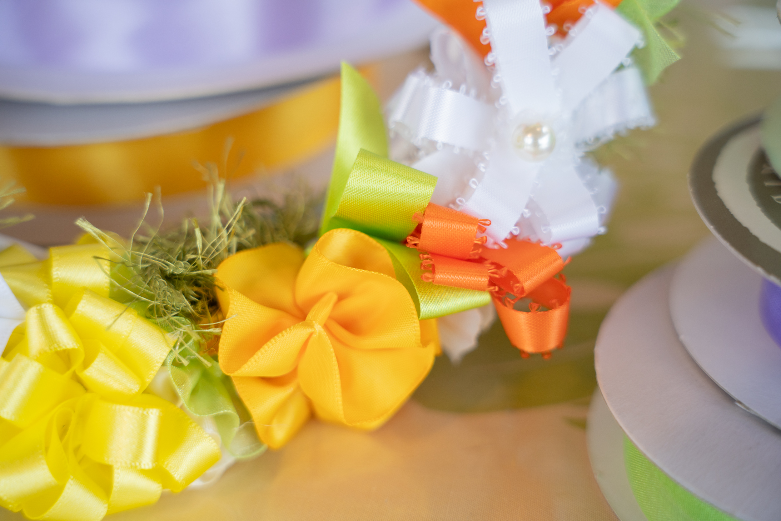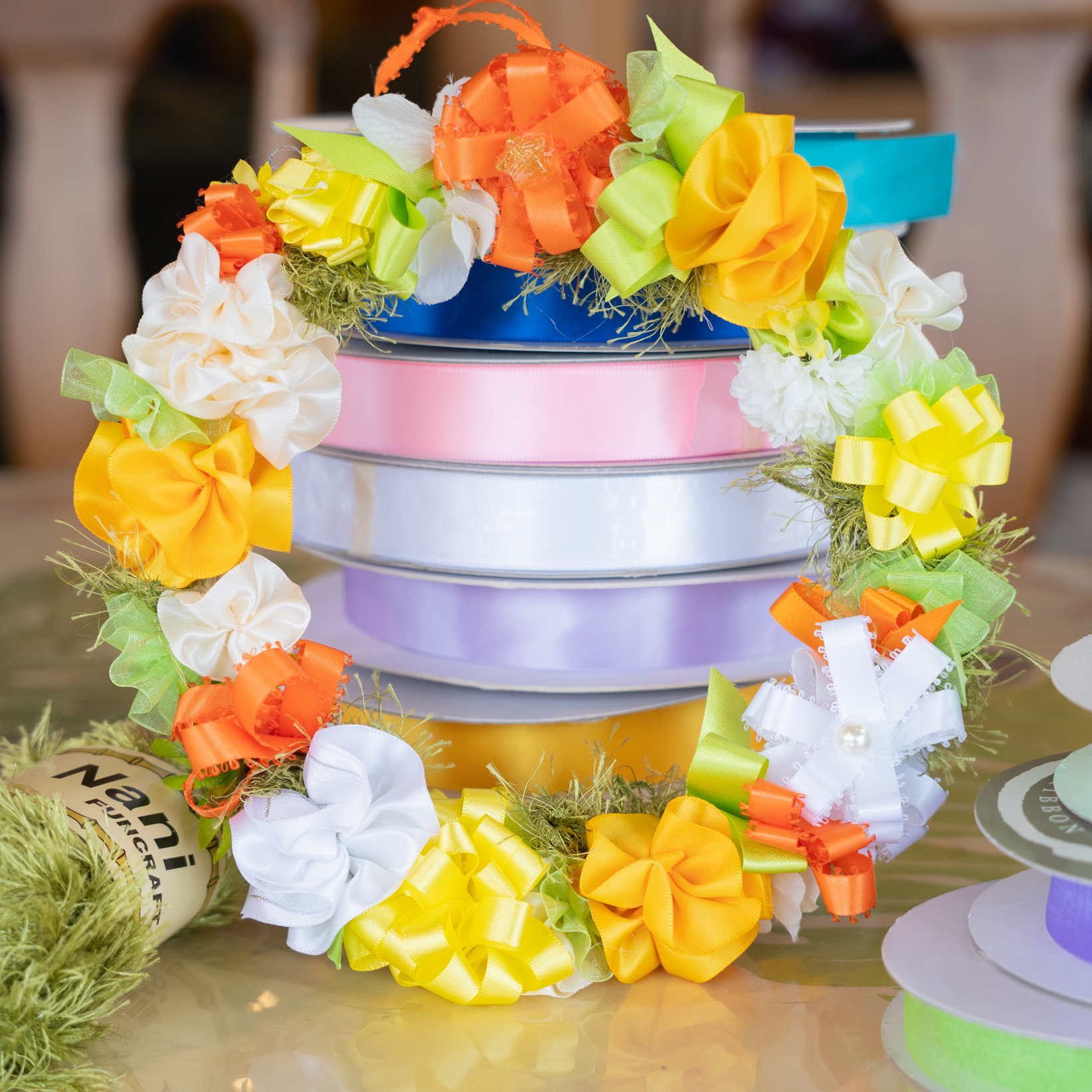 リースが完成したら、毛糸を使ってリボンのブローチをつくりましょう!
